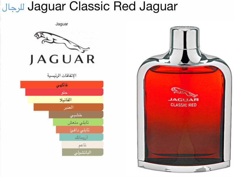 Jaguar Classic Red Jaguar عطر خشبي – أروماتك للرجال . Jaguar Classic Red صدر عام 2013. Karine Dubreuil-Sereni قام بتوقيع هذا العطر. إفتتاحية العطر توت العليق, التوت الأزرق و البرغموت; قلب العطر الفلفل الأسود, الياسمين و وتلاحظ Ozonic; قاعدة العطر تتكون من حبوب التونكا, العنبر, الفانيليا, خشب الأرز و الباتشولي.